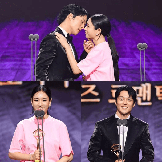 O apresentador Shin Dong-yup destacou a participação massiva dos internautas na votação, reforçando o peso da escolha popular. Quando os nomes de Ahn Eun-jin e Jang Ki Yong foram chamados, os dois se abraçaram naturalmente e caminharam juntos até o palco, em uma cena que parecia saída diretamente do dorama. A proximidade, os sorrisos cúmplices e a provocação de um quase beijo arrancaram aplausos calorosos e gritos entusiasmados dos fãs presentes.